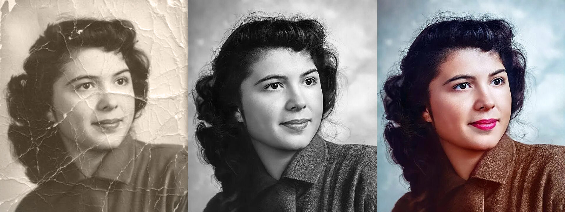 Реставрация — цифровое восстановление старых и повреждённых фотографий, ретушь — обработка изображения после съёмки, устранение дефектов.